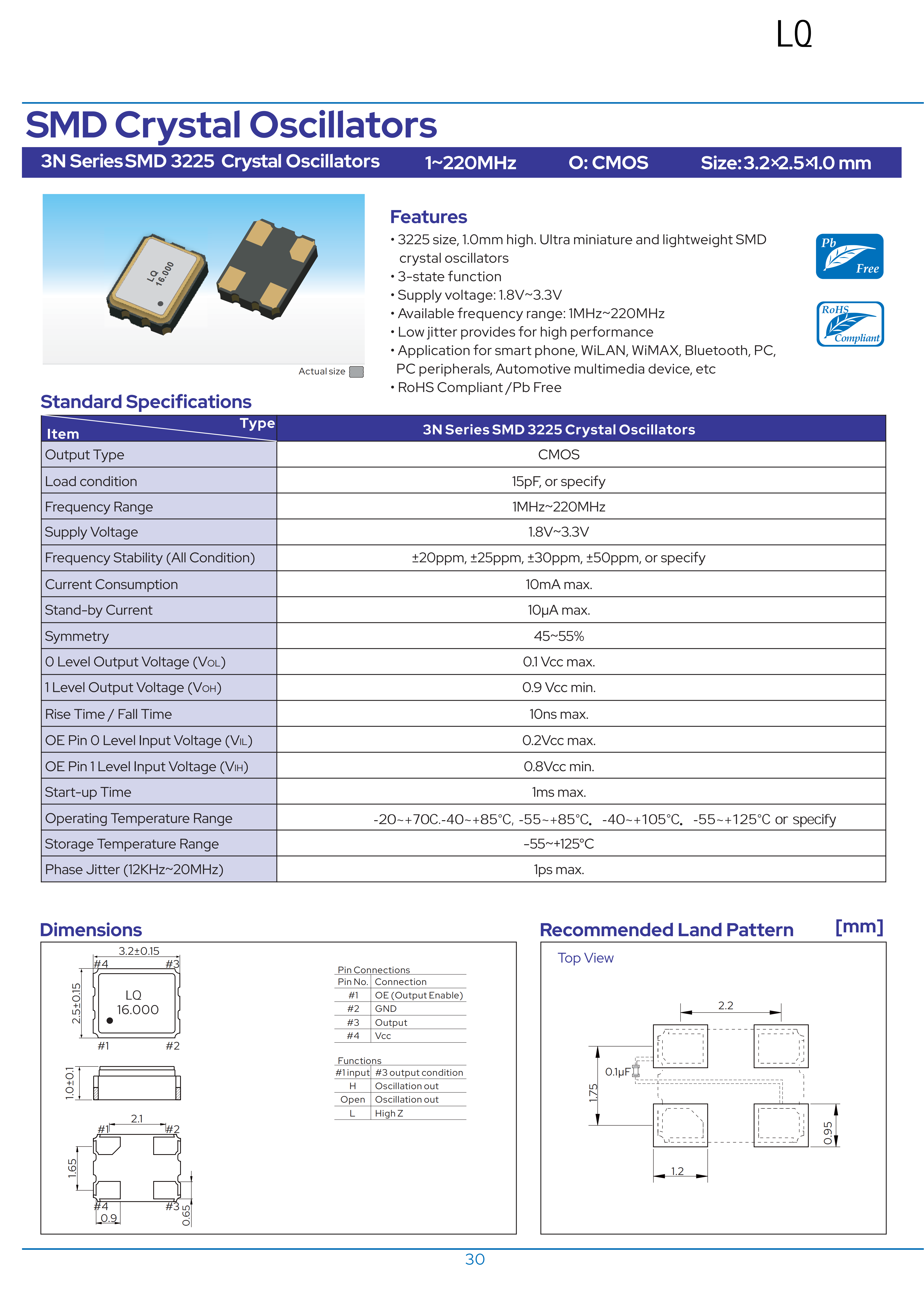 3225尺寸,高1.0毫米超小型和輕型SMD晶體振蕩器