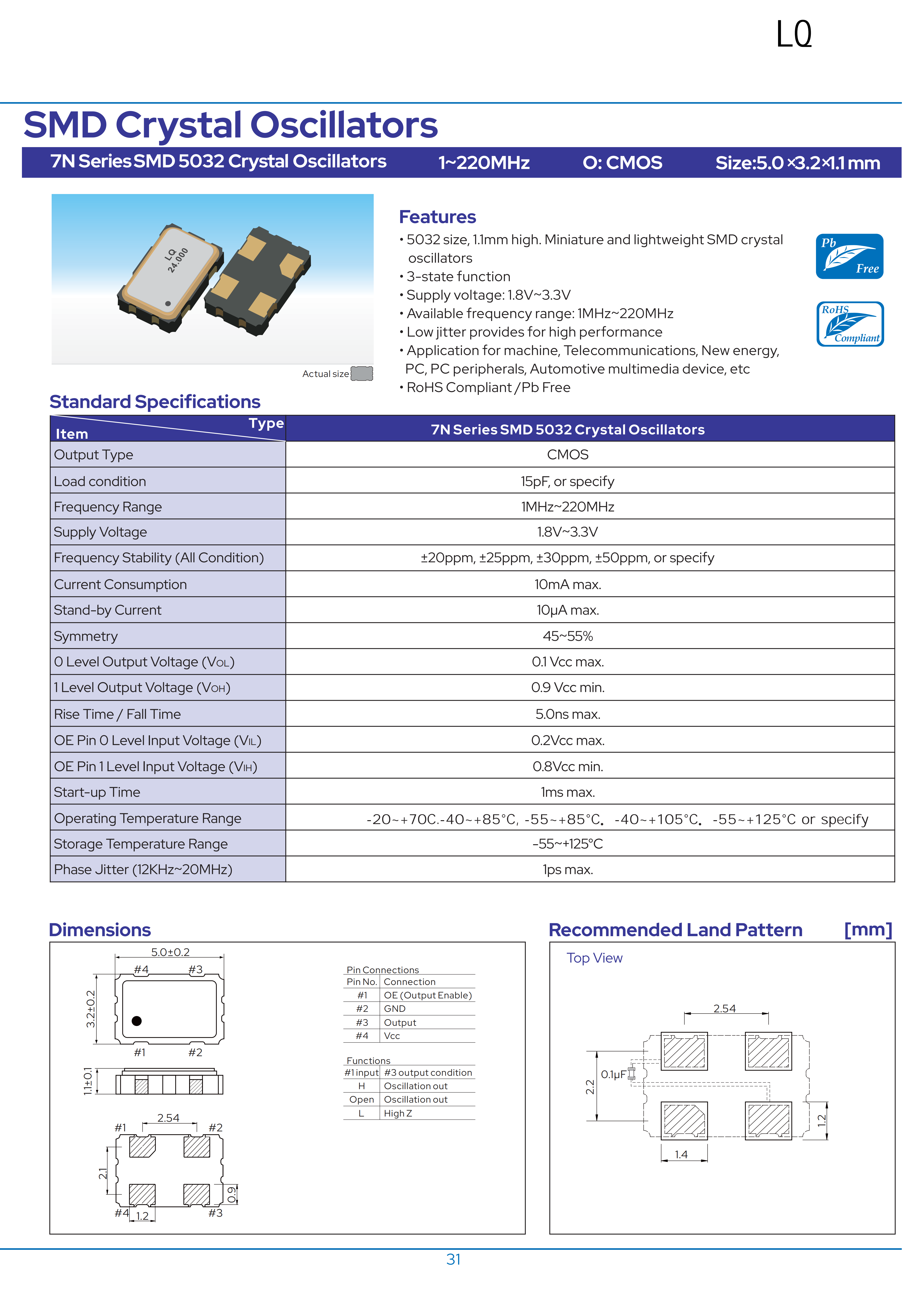 5032的尺寸,L.lmm高。微型和輕型SMD晶體振蕩器