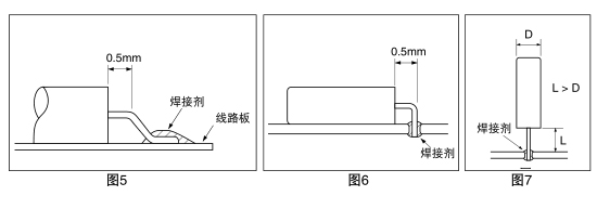 (1) 將導腳彎曲之后并進行焊接時,導腳上要留下離外殼0.5mm的直線部位。如果不留出導腳的直線部位而將導腳彎曲,有可能導致玻璃的破碎(參閱圖5和圖6)。